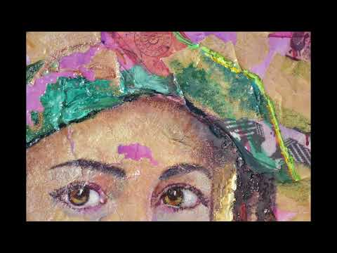 Ritratto di ragazza in abito tradizionale (Samugheo) Sardegna , con il caratteristico copricapo ricco di colori e ricami ,opera realizzata a tecnica mista a spatola con fogli di pane carasau, ( pane caratteristico dell'isola)su tela e resina.