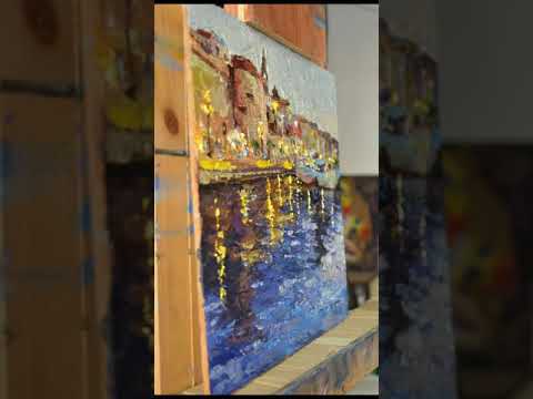 Alghero notturna ha ispirato l'artista , la veduta dell'antica e bella cittadina medioevale dal molo del porticciolo con i colori caldi dei lampioni che si specchiano sull'acqua .Dipinto realizzato a olio con spatola su pannello m.d.f.