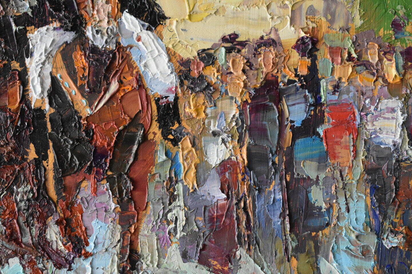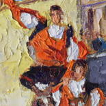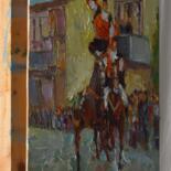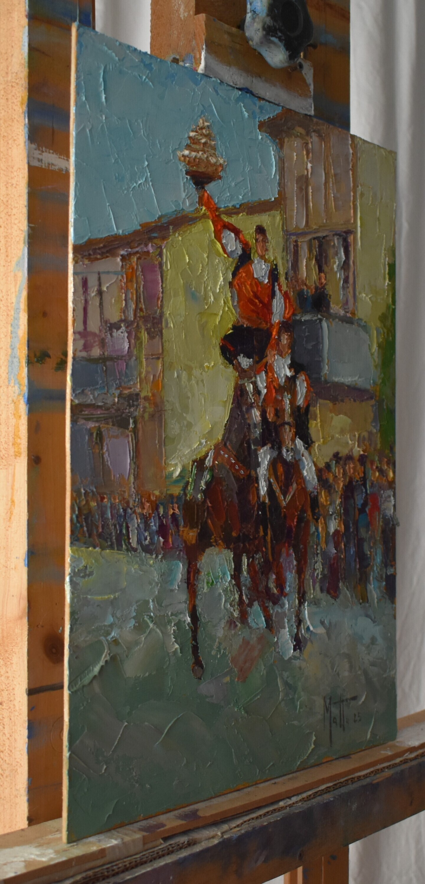 Nel creare questa opera, ho voluto catturare l'essenza vibrante e dinamica della festa popolare, dove tradizione e comunità si fondono in un momento di pura celebrazione. L'uso vigoroso della tecnica a olio e l'approccio impressionista accentuano il movimento e le emozioni del momento. Portando questa opera nella tua casa, porterai con te un pezzo di festa, allegria e unione, emanando energia e calore in ogni angolo.