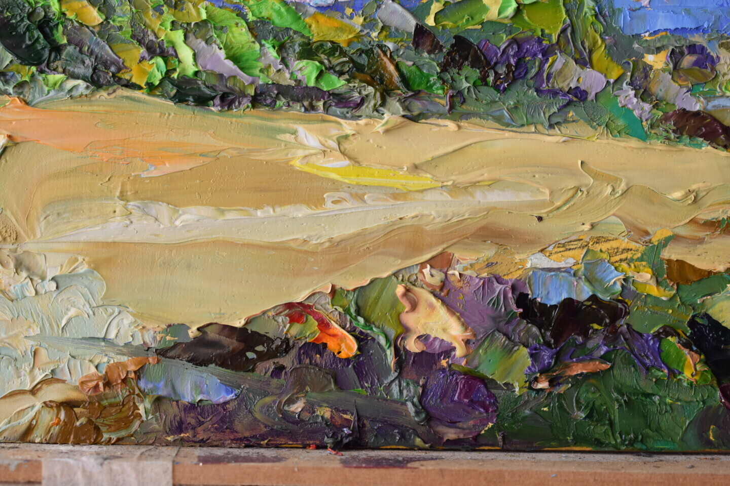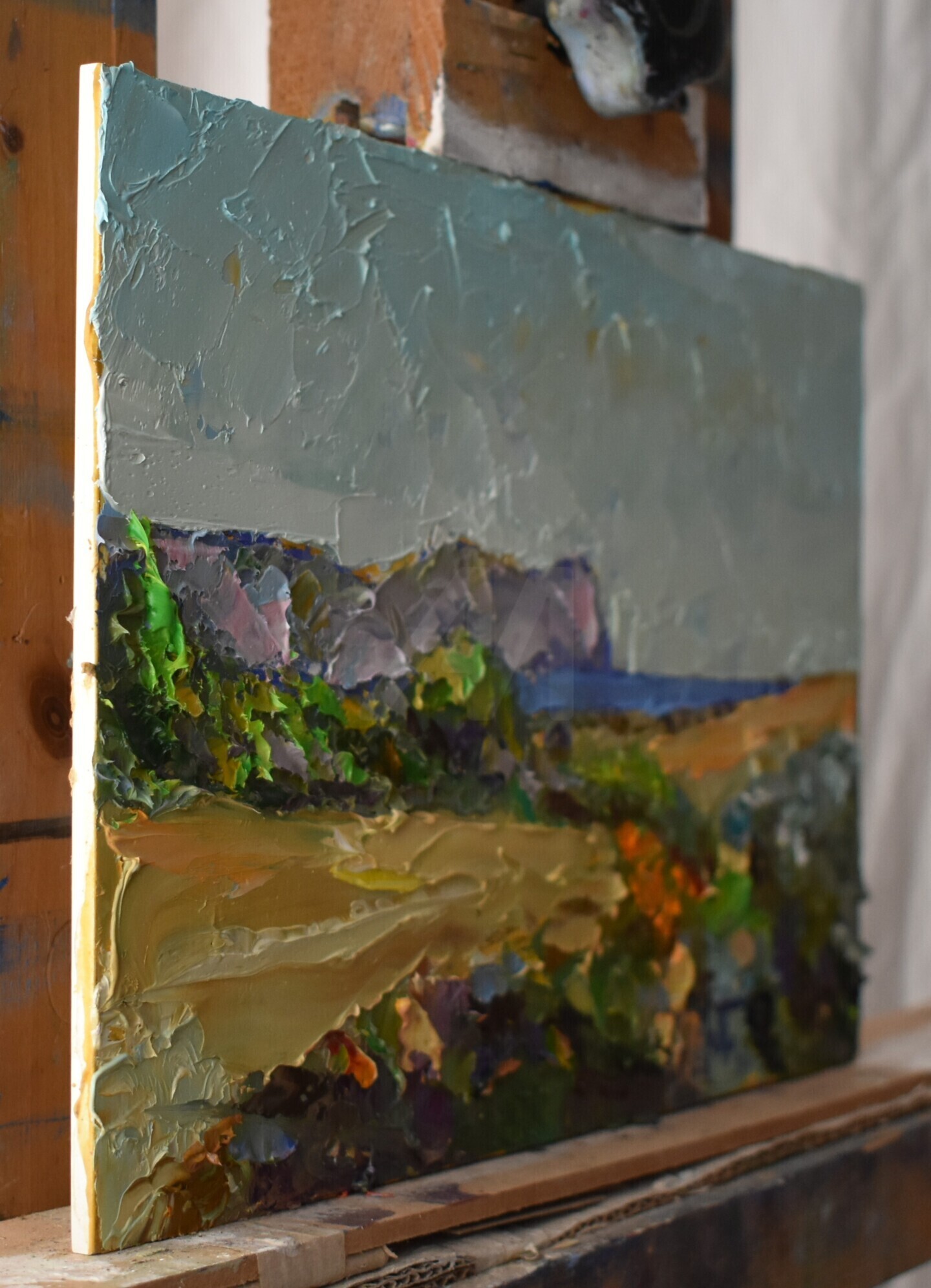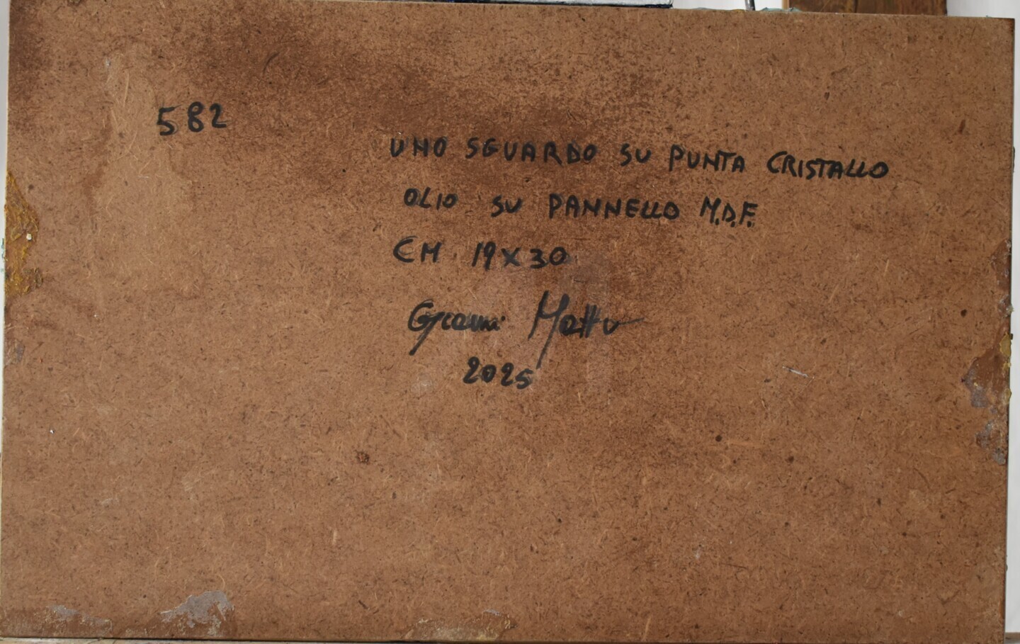 L'ho dipinto con la passione per i colori vividi e le forme naturali, usando la tecnica dell'olio spatolato in stile impressionista. Quest'opera rappresenta la vitalità e la bellezza transitoria dei paesaggi, (il promontorio di Punta Cristallo vista da casa).