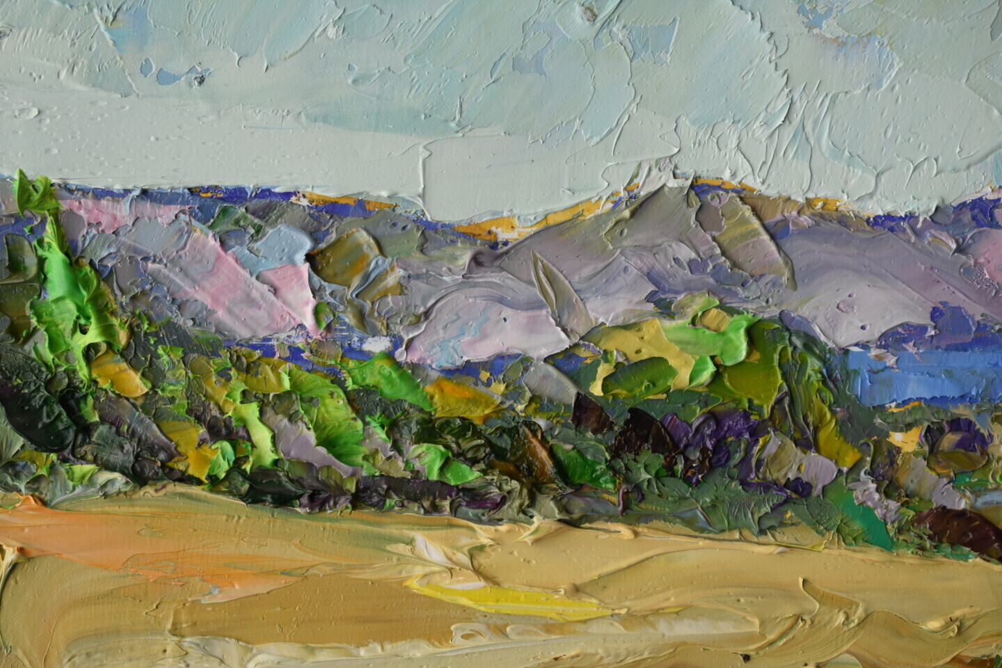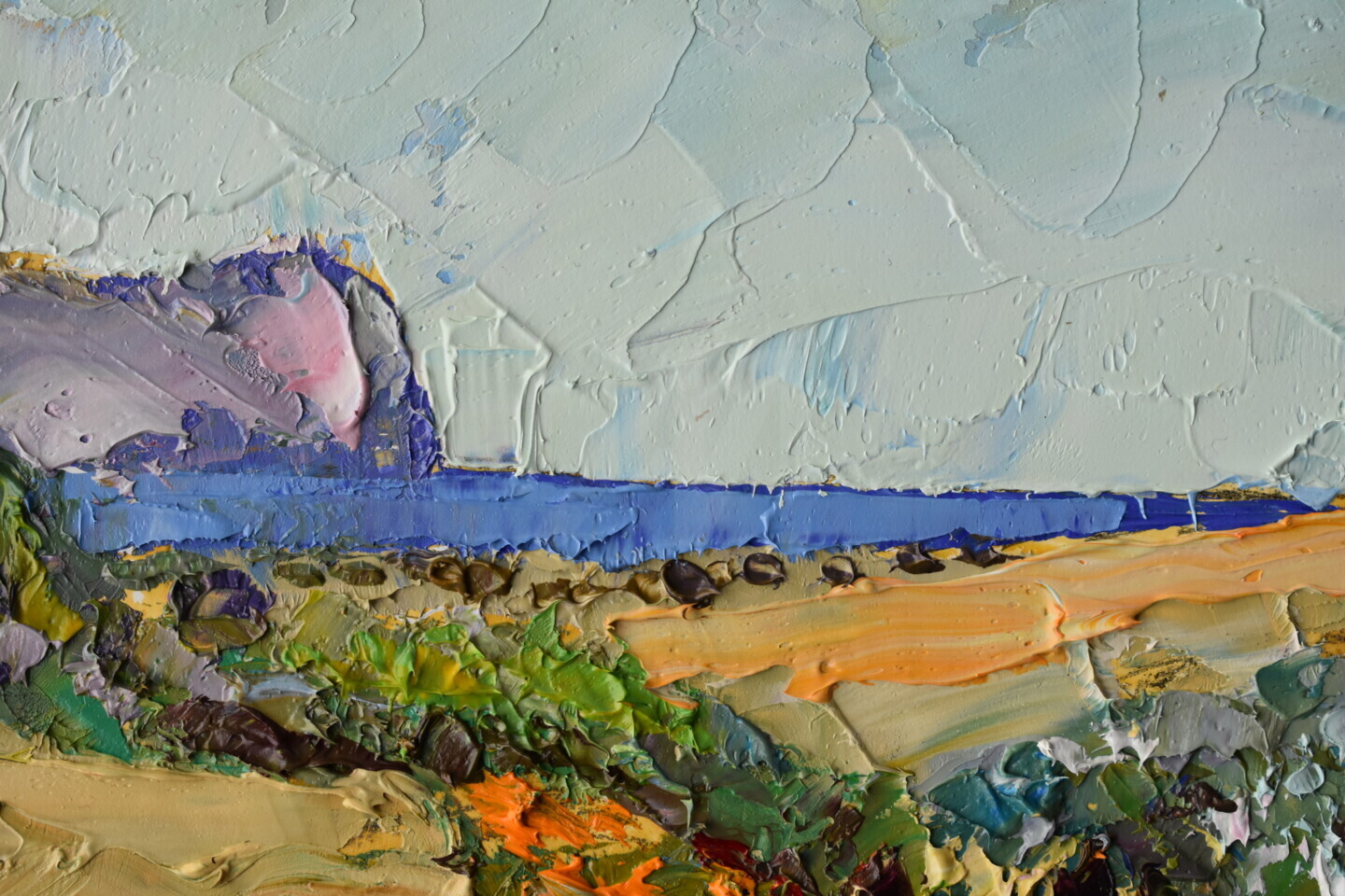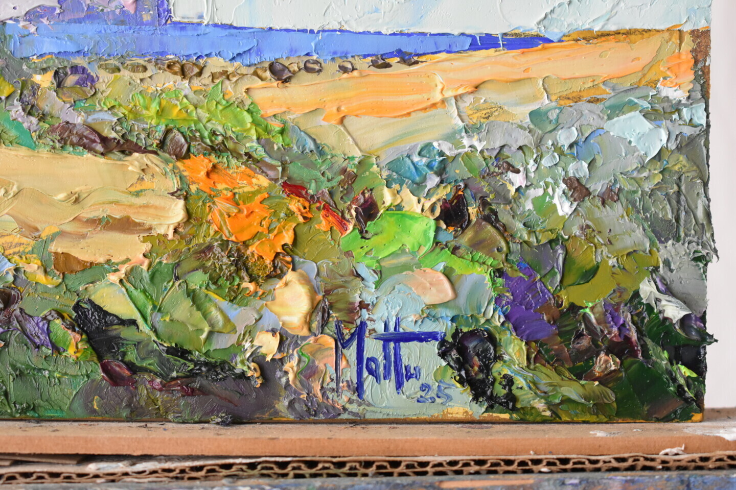 L'ho dipinto con la passione per i colori vividi e le forme naturali, usando la tecnica dell'olio spatolato in stile impressionista. Quest'opera rappresenta la vitalità e la bellezza transitoria dei paesaggi, (il promontorio di Punta Cristallo vista da casa).